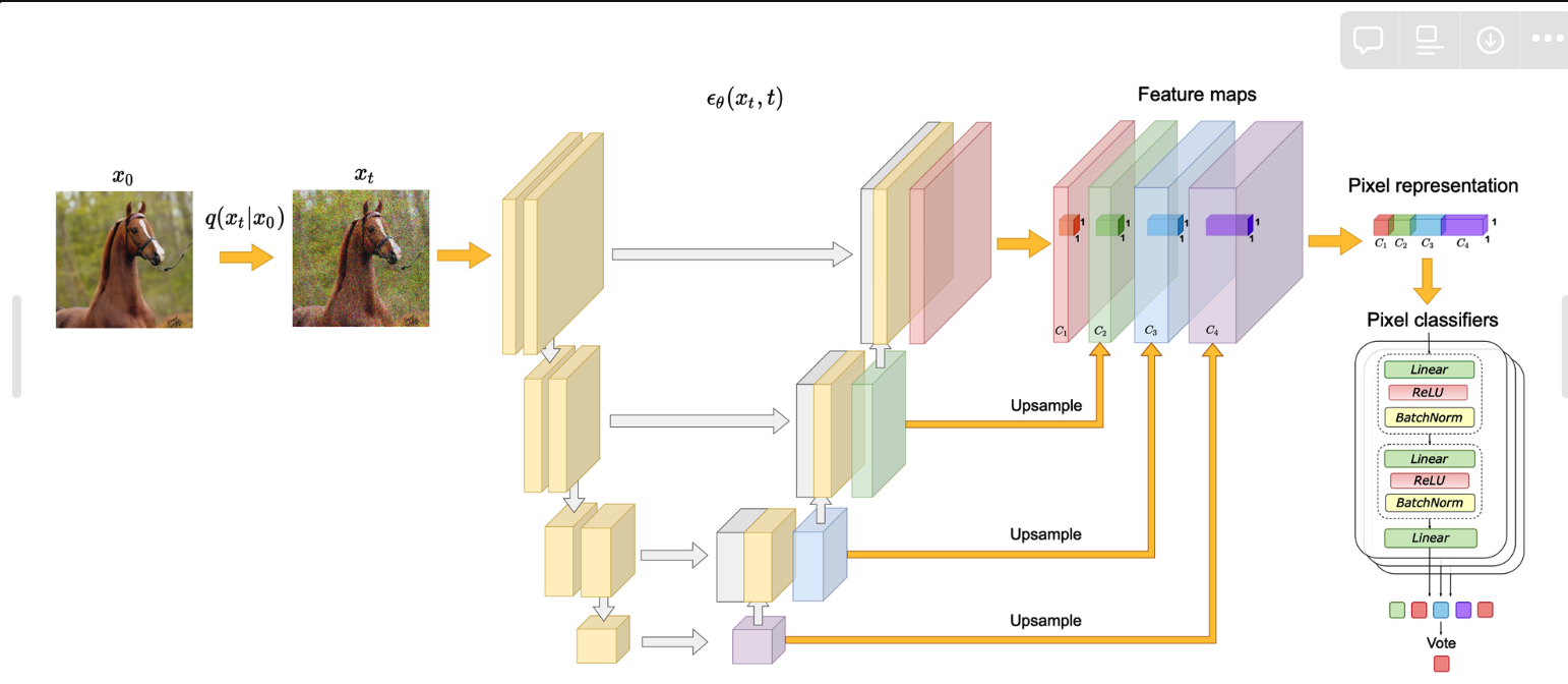 用扩散模型估计噪声的UNet提取的特征作为学习到的图像表征,即执行前向过程,固定不同step的噪声,然后不同step加噪声会生成相应的x_t,训练一个MLP分类起得到最终的分割结果;