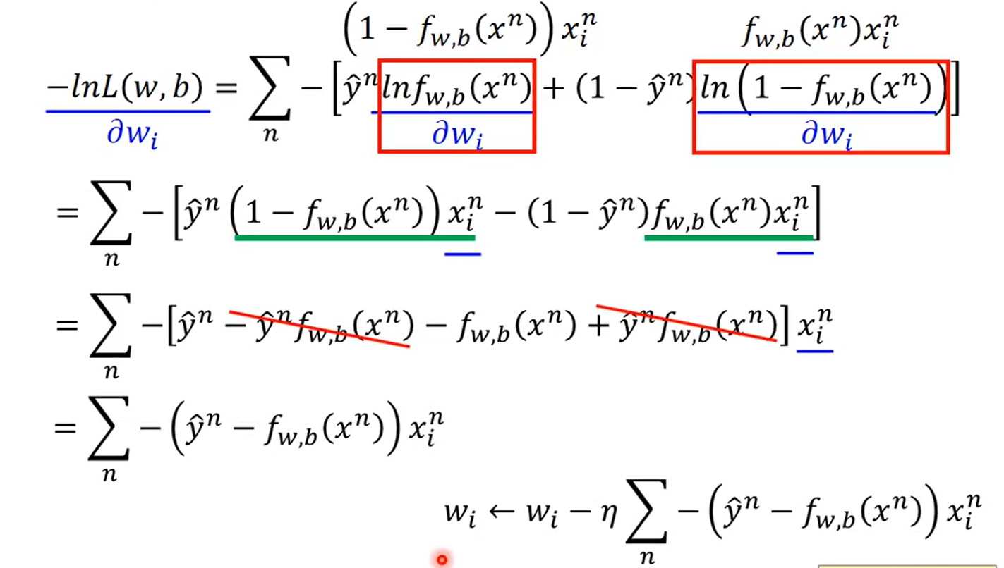上述函数对w求偏微分之后,也就是求出了梯度,(过程可以自己算一下,挺简单的),就得到了下面的公式,此时更新参数就和线性回归相同也推出来了。