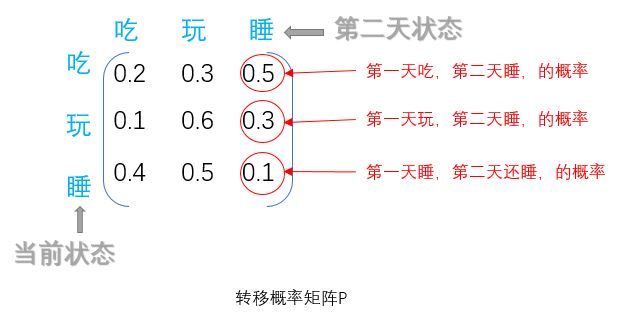 每一个状态转移都有一个概率值,称为状态转移概率——这是从一个状态转移到另一个状态的概率。所有的M*M个概率可以用一个状态转移矩阵表示。注意这些概率并不随时间变化而不同——这是一个非常重要(但常常不符合实际)的假设。转移概率矩阵一个示意图如下图,有三种状态,所以有九种状态转移概率: