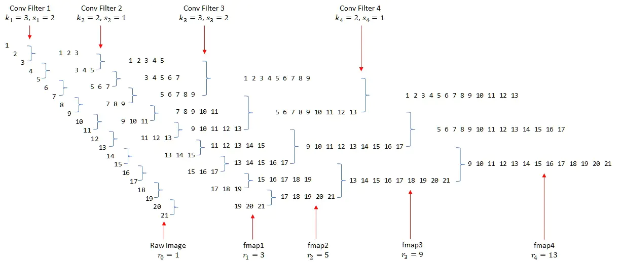 其中,rn表示第n层的接受野;Si表示第i层的步长
