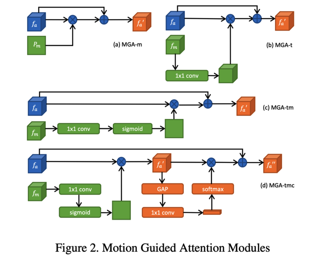 从光流图提取运动特征;多任务;新的运动特征融合方法 GitHub - lhaof/Motion-Guided-Attention: Motion Guided Attention for Video Salient Object Detection, ICCV 2019 蓝色方块表示Appearance;绿色方块表示Motion; 上面就是几种不同的计算Attention然后进行特征融合的方法 似乎挺有意思,后续详细读一哈