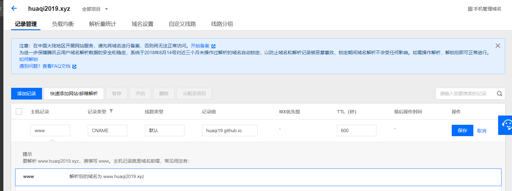 进入腾讯云控制台,在自己的域名解析处设置如下:
